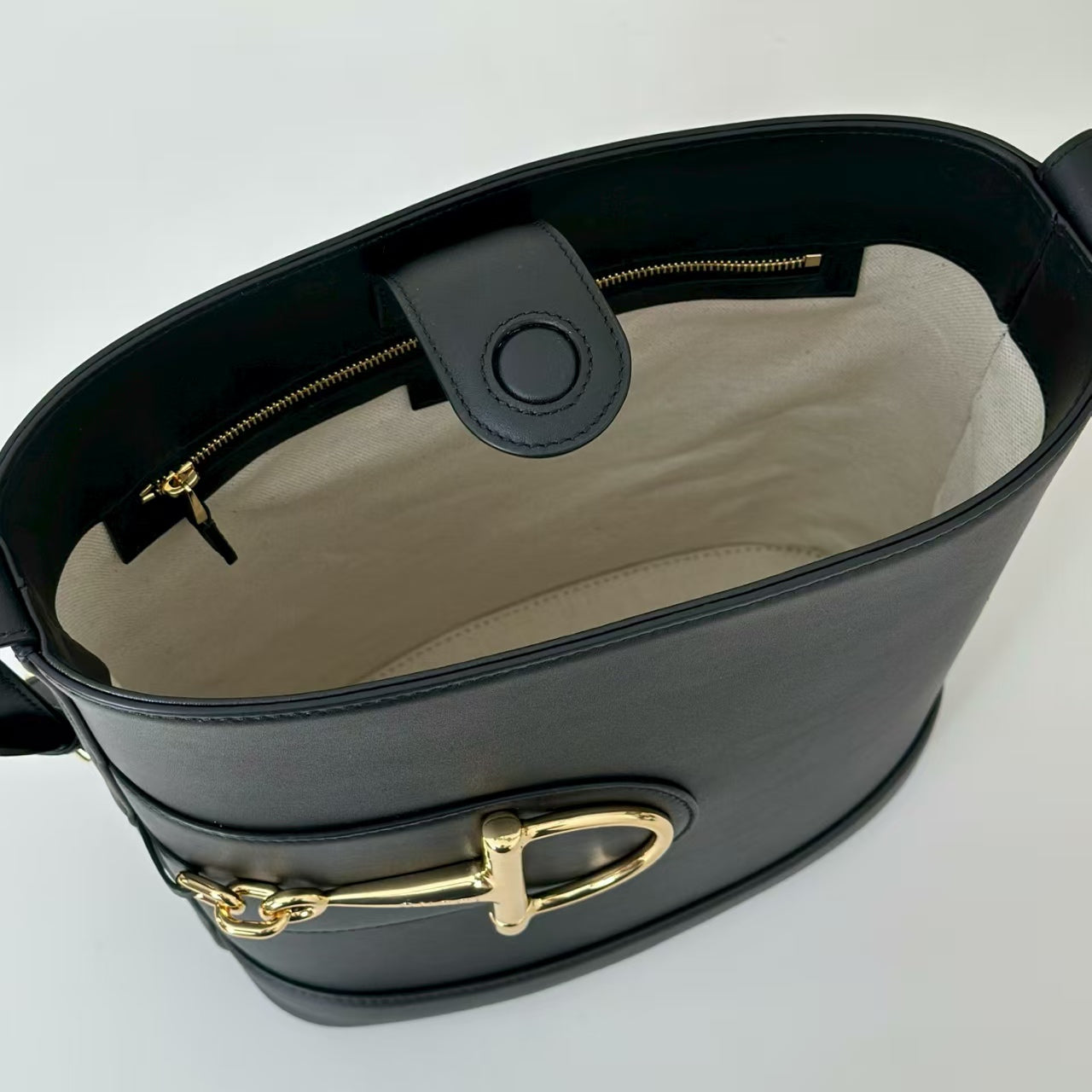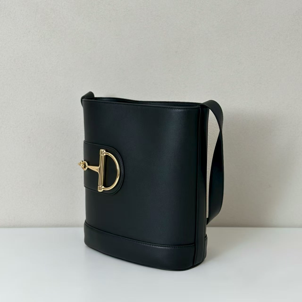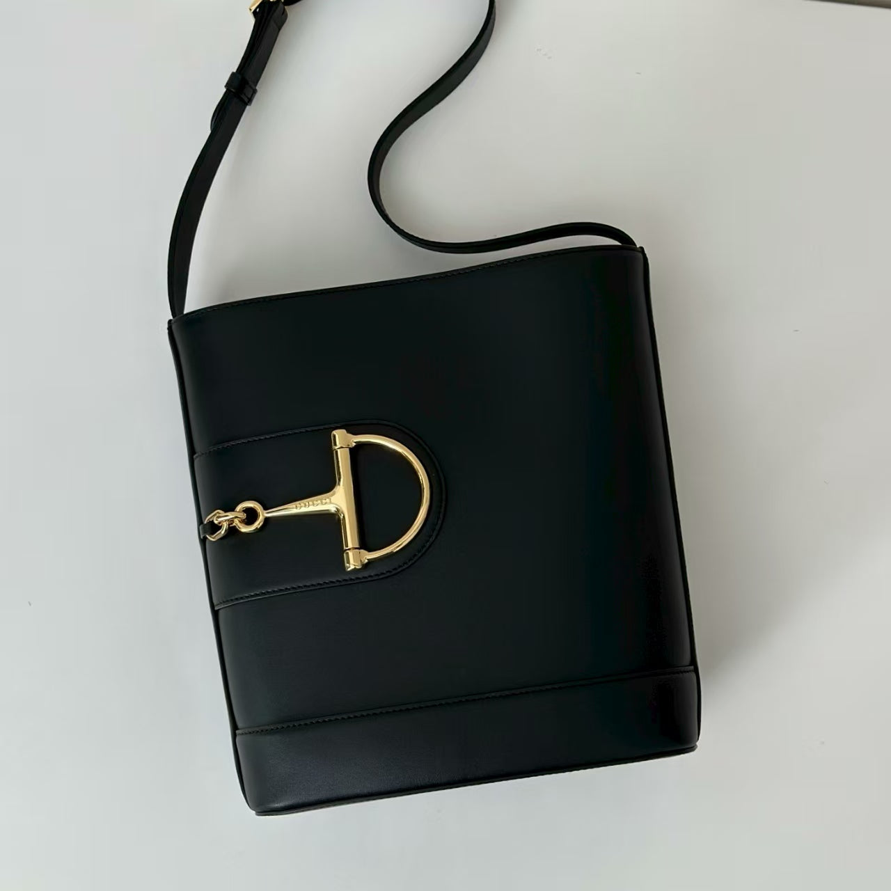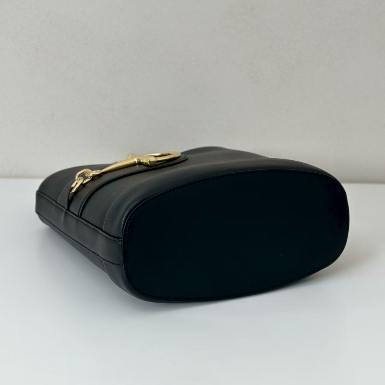 This is a pre-owned authentic Gucci 73 Medium Bag, crafted in black leather with gold-tone Horsebit hardware. Originally introduced in the Spring/Summer 2025 collection, the design draws inspiration from an archival 1973 bucket bag.