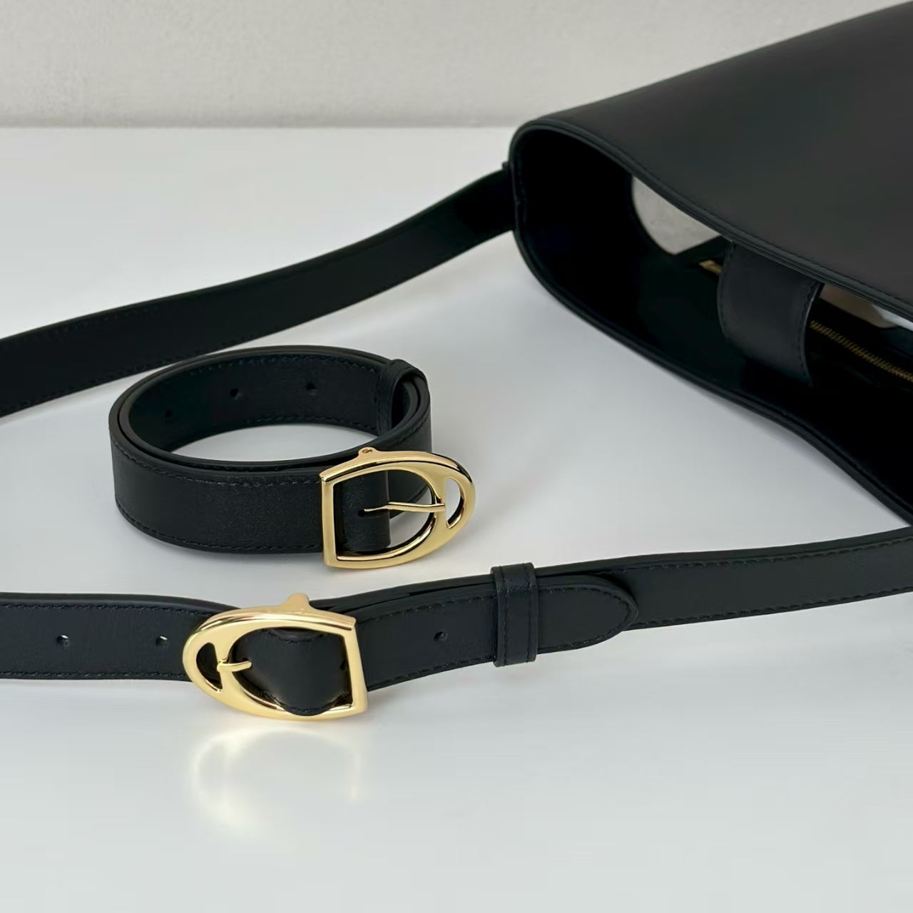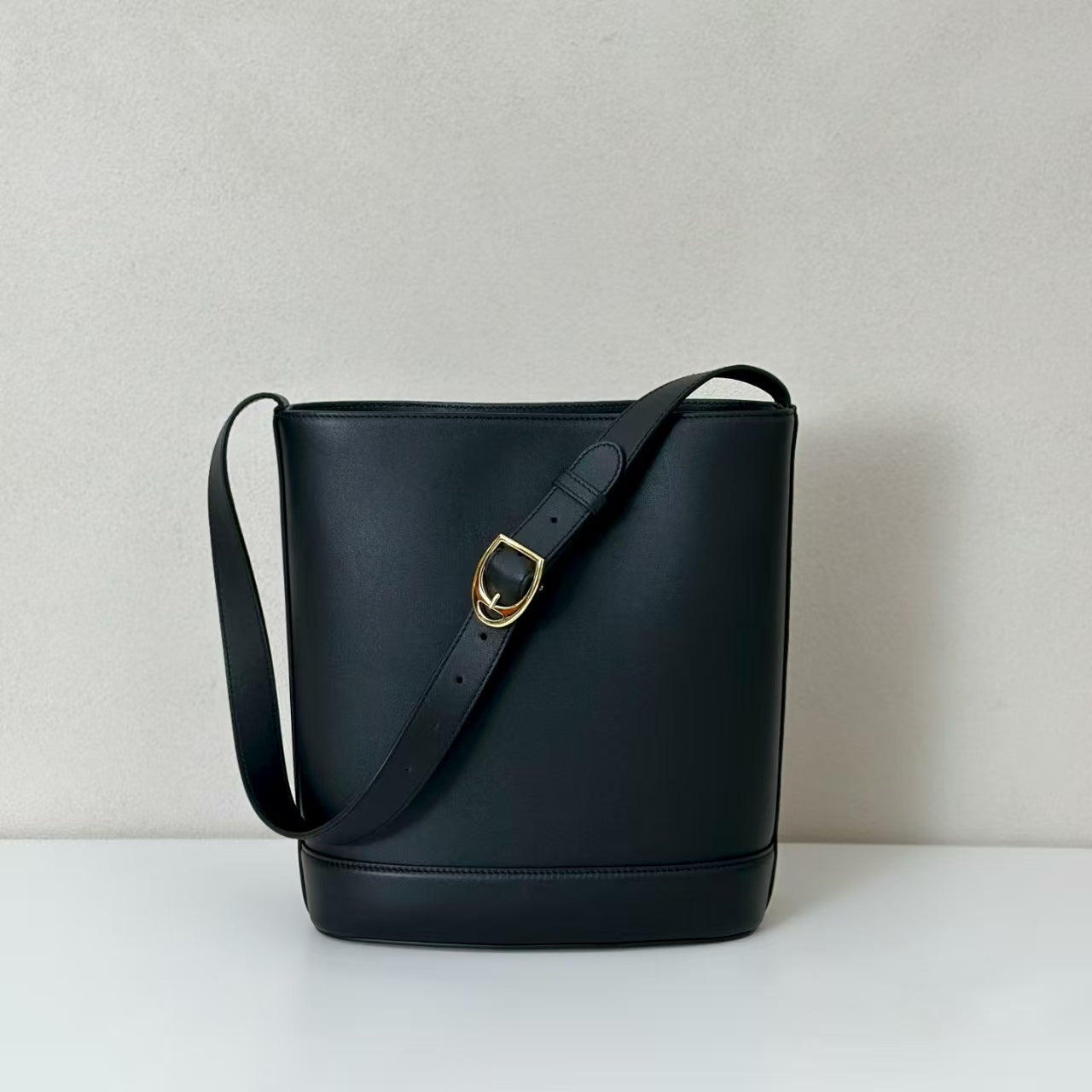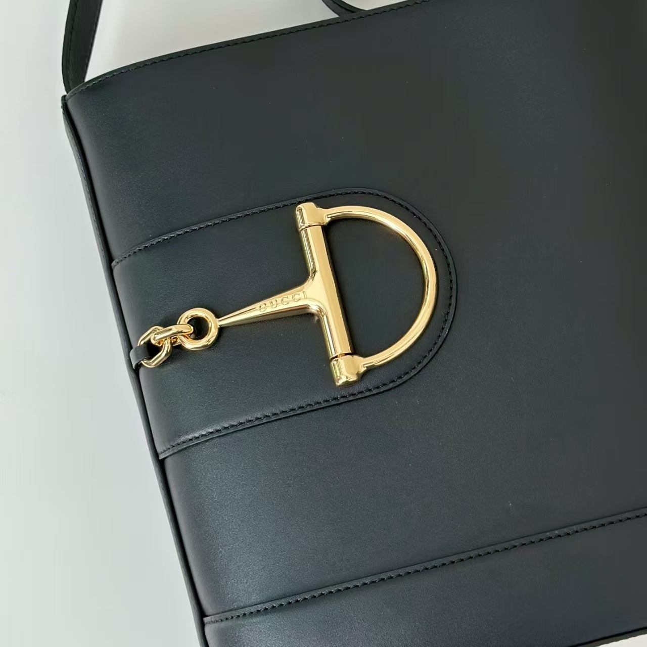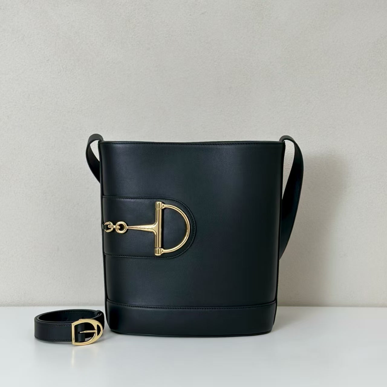 This is a pre-owned authentic Gucci 73 Medium Bag, crafted in black leather with gold-tone Horsebit hardware. Originally introduced in the Spring/Summer 2025 collection, the design draws inspiration from an archival 1973 bucket bag.
