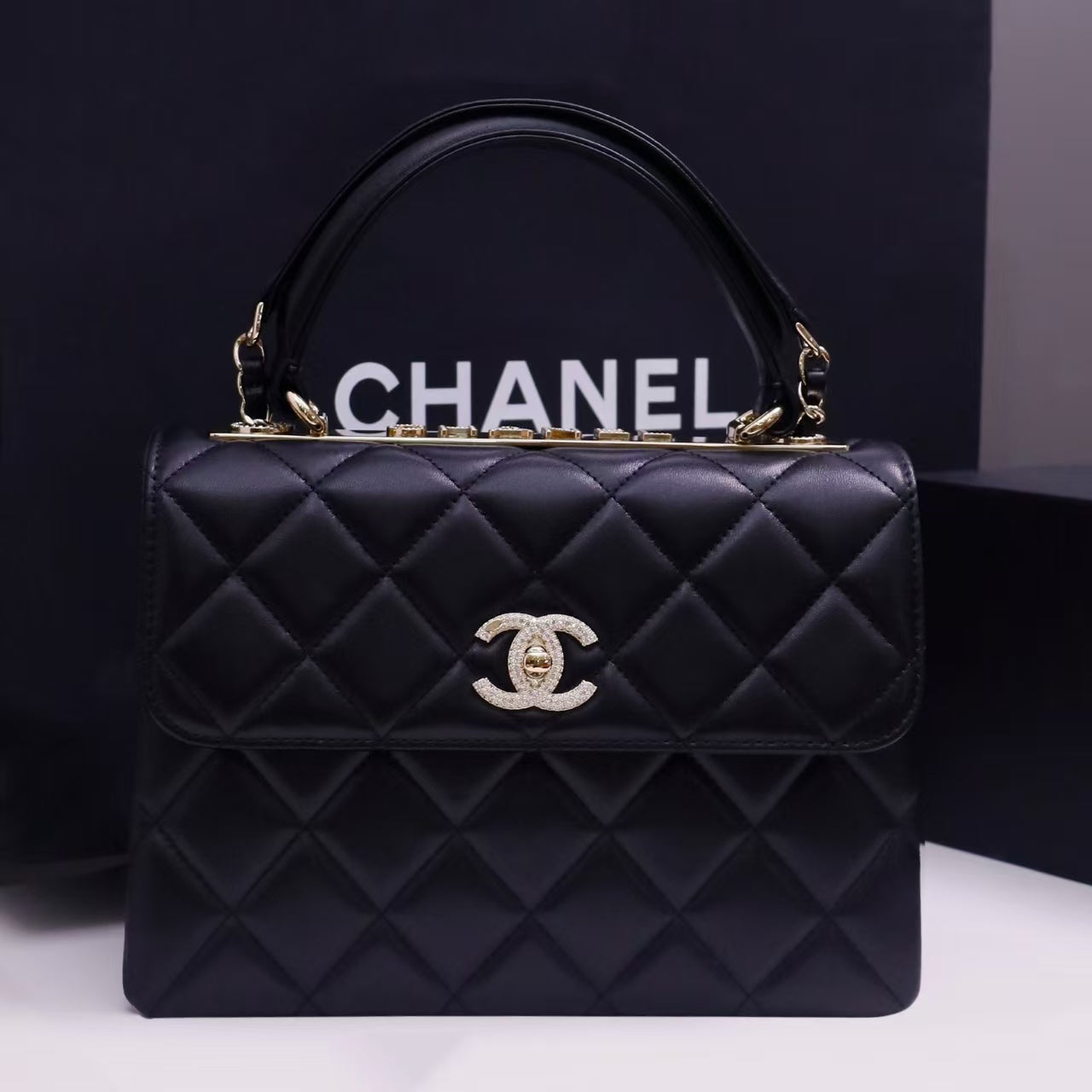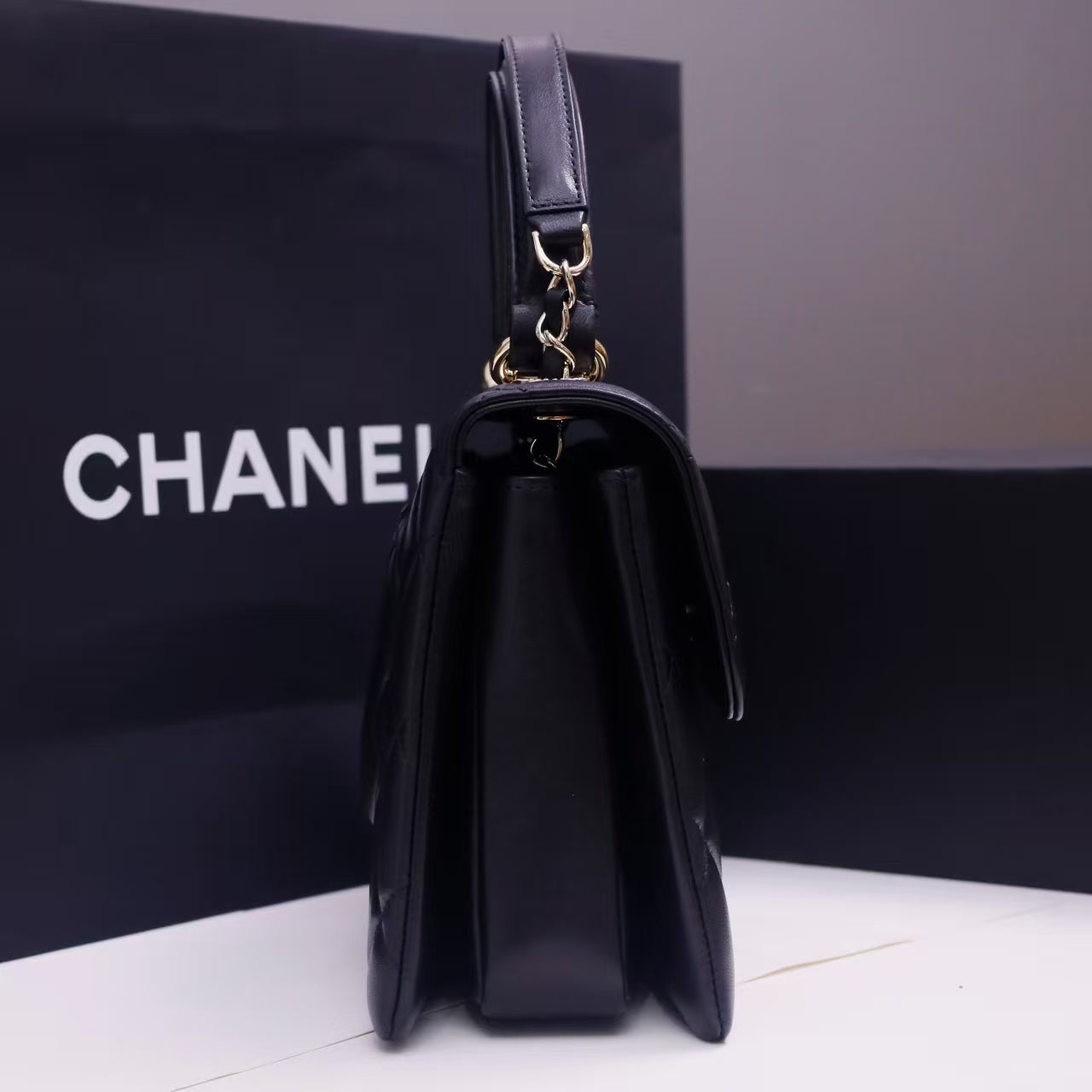 This Chanel Trendy Black Bag is crafted from original single-source imported lambskin leather and finished with authentic hardware components. The interior is lined with Chanel’s signature fabric, offering both style and durability. A timeless piece, it can be carried as a top-handle or shoulder bag, making it versatile for different occasions.