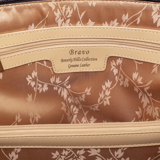Enamel Coated Italian Calfskin Leather Gold Leaf Embroidered Cotton Polyester Twill Lining Inner Zipper Middle Pocket Outside Rear Zipper Pocket 1 Inner Zipper Side Pocket, 2 Inner Side Pockets (For Cell/PDA) Nickel Plated Hardware Feet