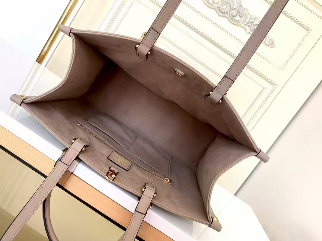 The Pre-Owned Authentic OnTheGo Medium Tote is printed and embossed on soft grain cowhide with the monogram pattern. Its ample interior can accommodate notebook computers and other office supplies. The length of the handle is convenient for carrying or shoulder back.